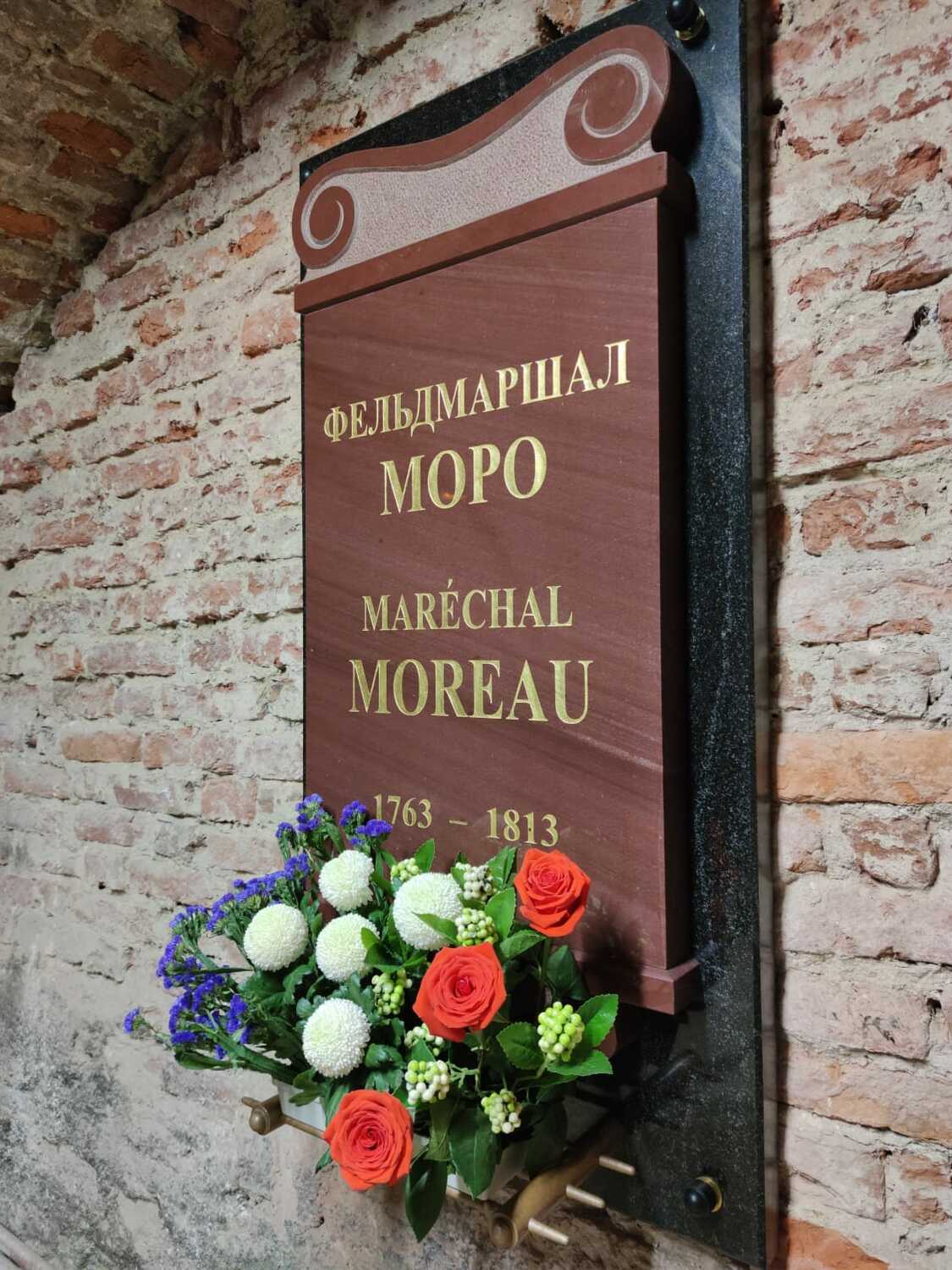 Жан Виктор Моро — французский полководец, генерал Первой французской республики, главный противник Суворова в Итальянском походе, был побеждён Суворовым в сражении на реке Адде и отступил к Генуэзской Ривьере. Несколько лет Моро прожил в Северной Америке, а в 1813 году вернулся в Европу по приглашению императора Александра I. Здесь он выступил в роли советника при главной квартире союзных монархов. В сражении под Дрезденом 27 августа 1813 года генерал был смертельно ранен ядром. 2 сентября 1813 года Жан Виктор Моро скончался. Тело его было отвезено в Санкт-Петербург и погребено в католической церкви Святой Екатерины. 13 июля 2017 года генеральный консул Франции Тибо Фуррьер передал базилике Святой Екатерины мемориальную доску для установки на гробнице фельдмаршала Моро.